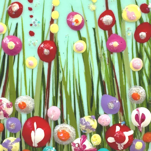 I make each one by hand from polymer clay, then carefully paint a tiny meadow scene using the same professional quality paints that I use for my original paintings. I then add a little sparkle and seal them with varnish for protection before adding a silver-plated brooch back with a safety catch.